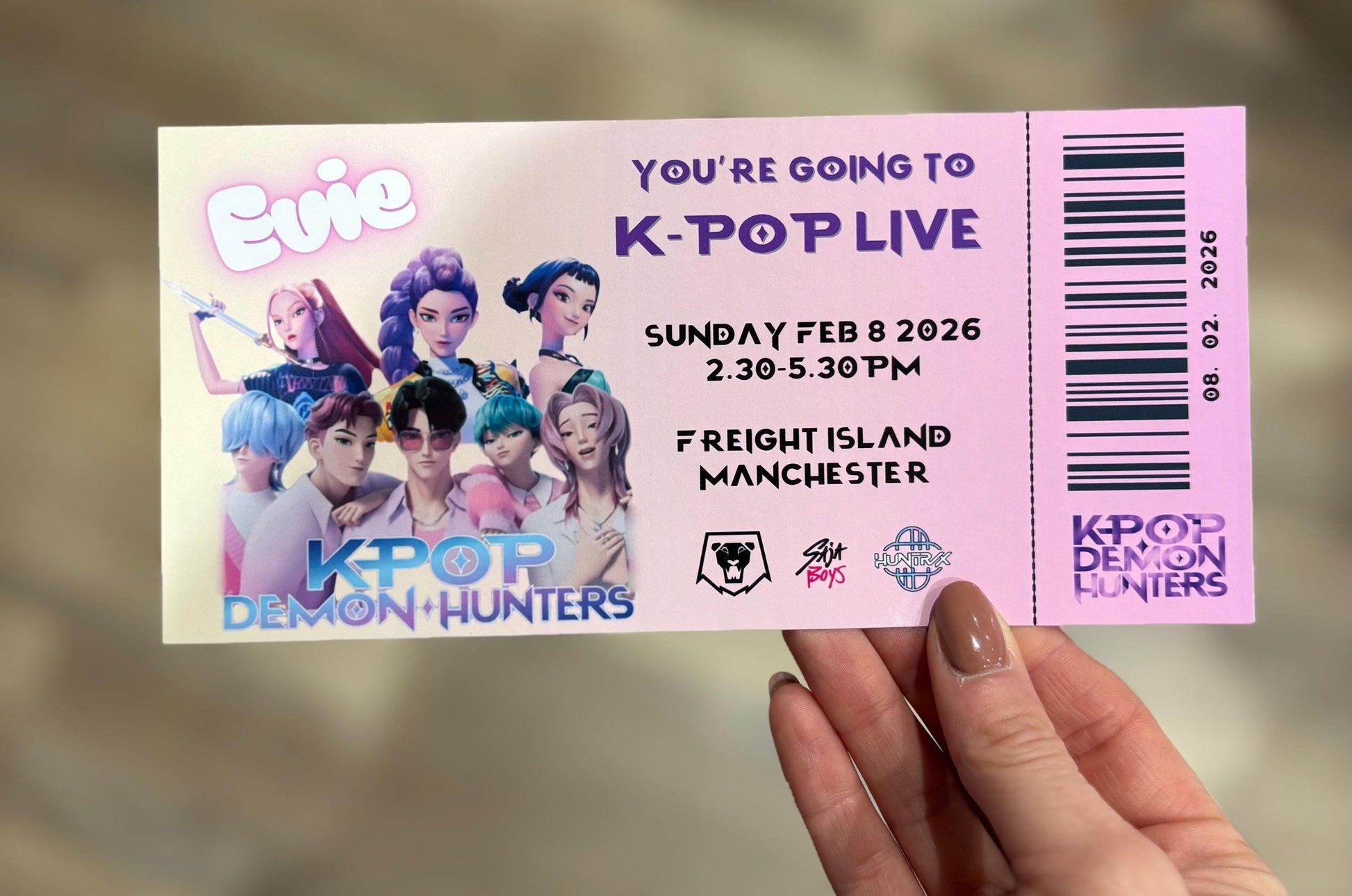 Printed on high-quality 300gsm glossy photo card for a realistic ticket feel. Includes envelope in a colour of your choice.
